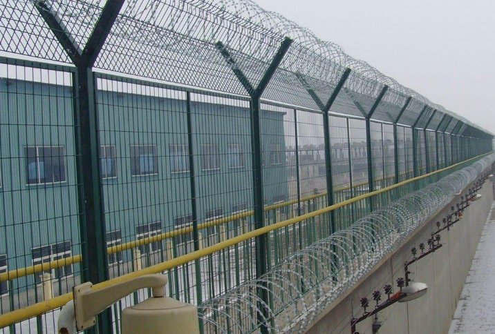 監獄鋼網墻由鍍鋅刺絲滾籠由鋒利的刀型刺由雙線扣裝后成蛇腹狀,既美觀又讓人不寒而栗。起到了很好的阻嚇作用。同時該產品具有美觀、防阻效果好、施工便利等優點。